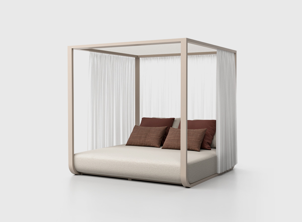 Daybed fabricada en aluminio en tono white wash, combina a la perfección durabilidad y elegancia. Con un diseño espacioso y ergonómico que invita a relajarse con los suyos, este mueble añade un toque de distinción atemporal a su terraza.