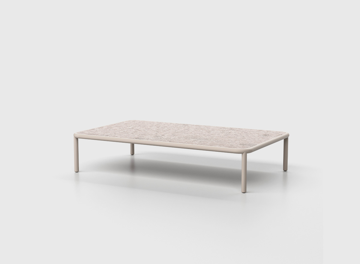 Mesa de centro que combina una estructura sólida de aluminio en tono white wash con una superficie de Dekton VK03, lo que le añade un toque de distinción y elegancia.