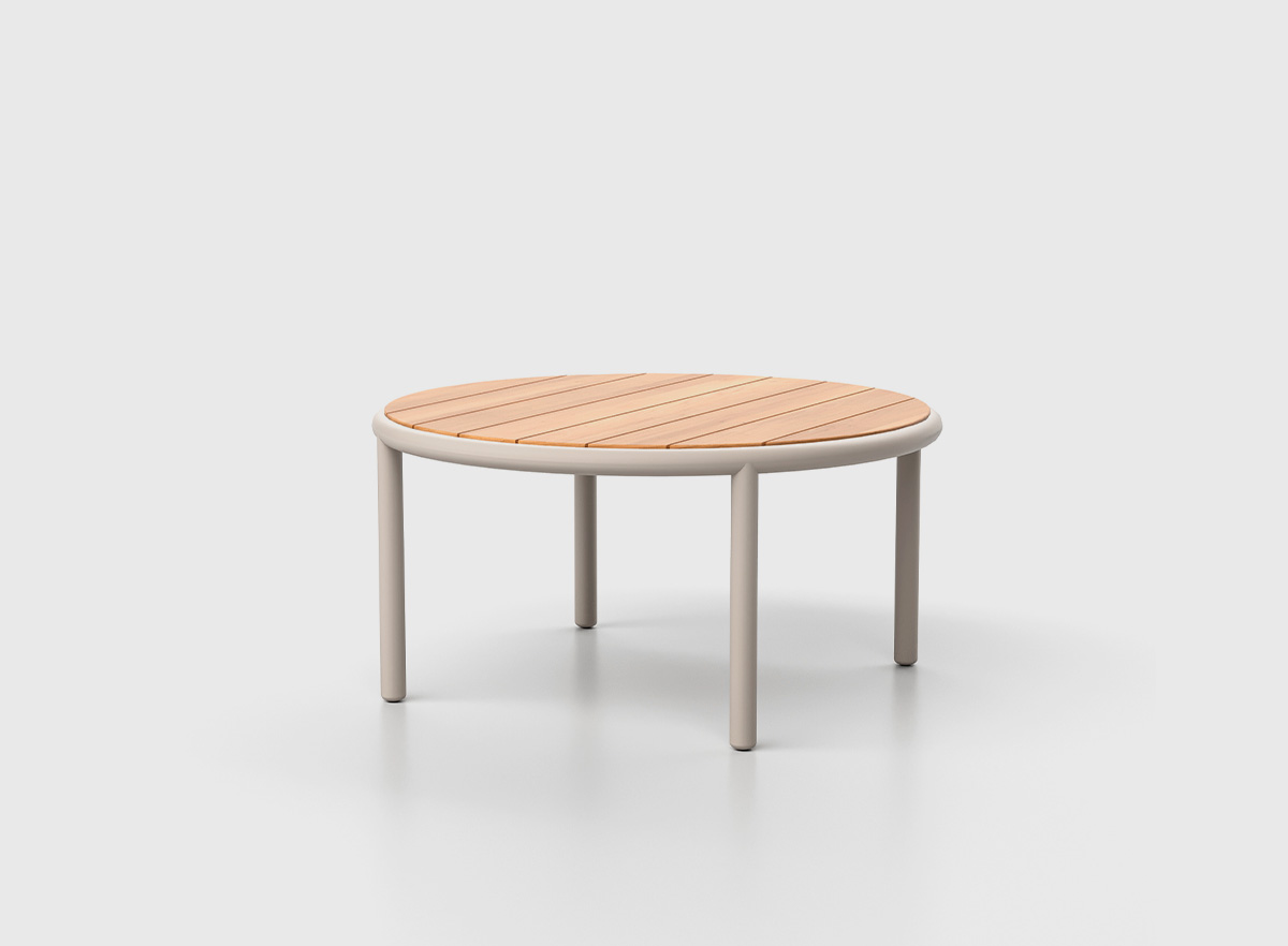 Mesa de centro que combina una estructura sólida de aluminio en tono white wash con una superficie de teca natural, añadiendo un toque de calidez.
