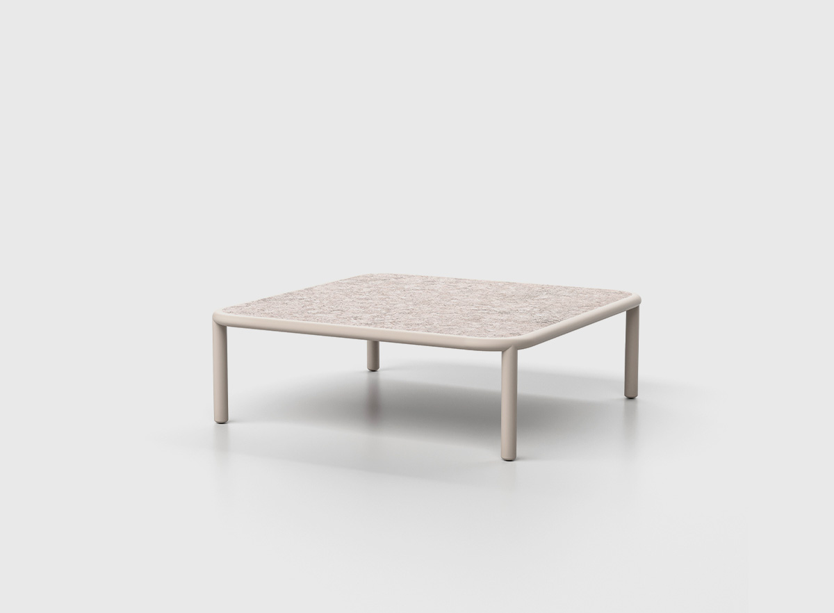 Mesa de centro que combina una estructura sólida de aluminio en tono white wash con una superficie de Dekton VK03, lo que le añade un toque de distinción y elegancia.