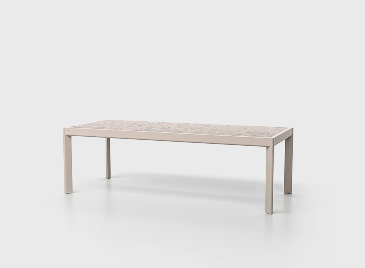 Mesa de comedor que combina una estructura sólida de aluminio en tono white wash, con una superficie de Dekton VK03, que añade un toque de distinción y elegancia.