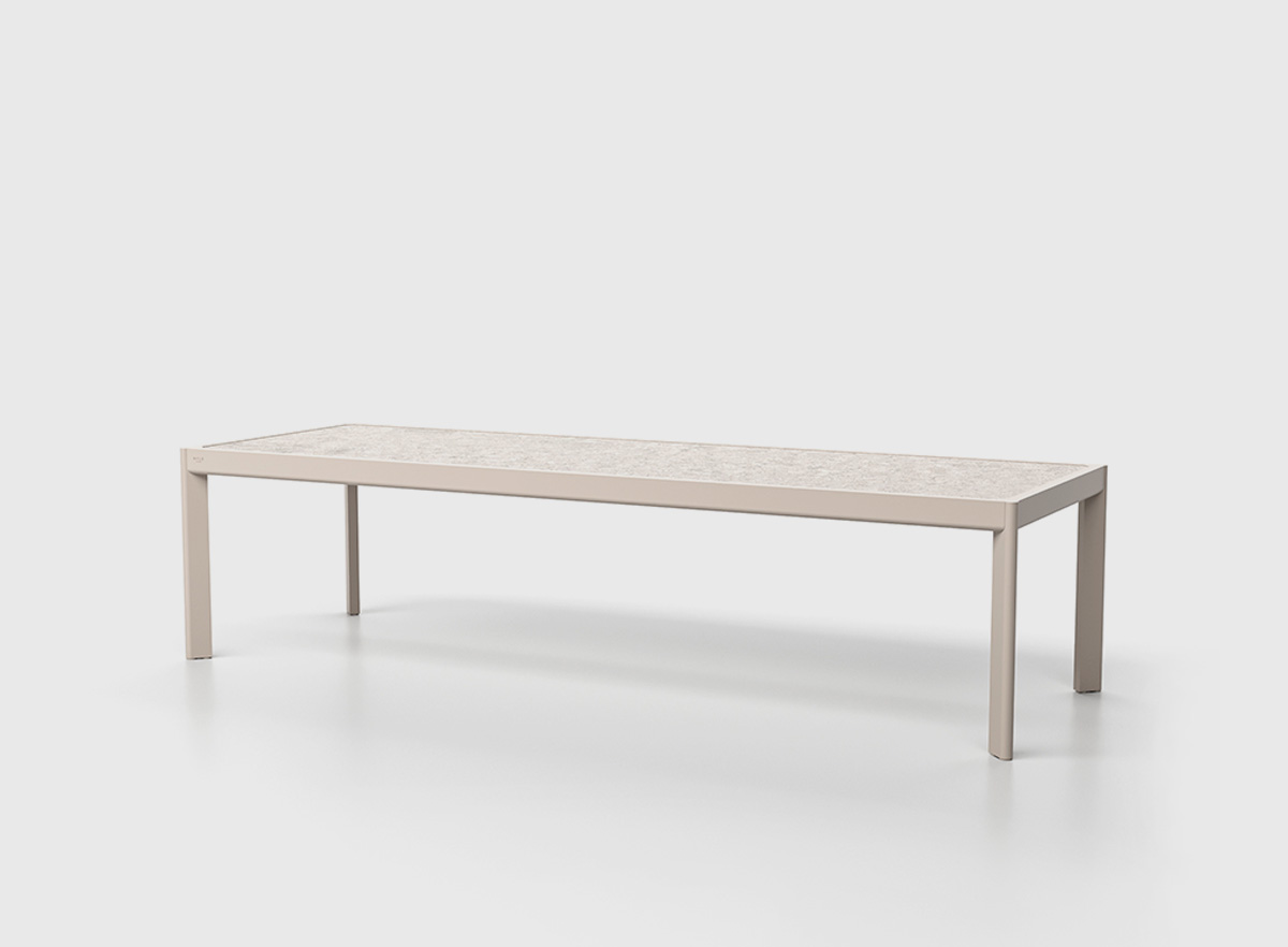 Mesa de comedor que combina una estructura sólida de aluminio en tono white wash, con una superficie de Dekton VK03, que añade un toque de distinción y elegancia.