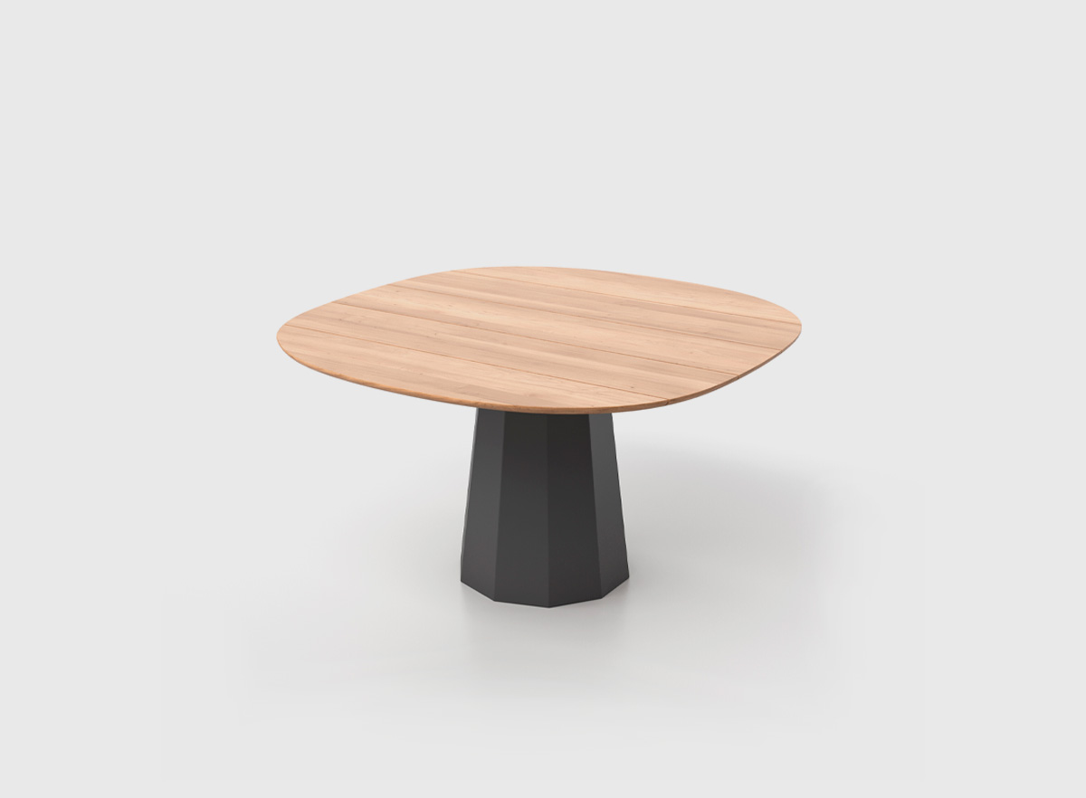 Mesa comedor que fusiona una sólida estructura de aluminio en tono carbono mate, con un tablero de teca natural, que le aporta un toque de calidez. Cada pieza es única debido a la naturaleza de los materiales utilizados, ofreciendo matices y texturas distintivas que realzan su singularidad.