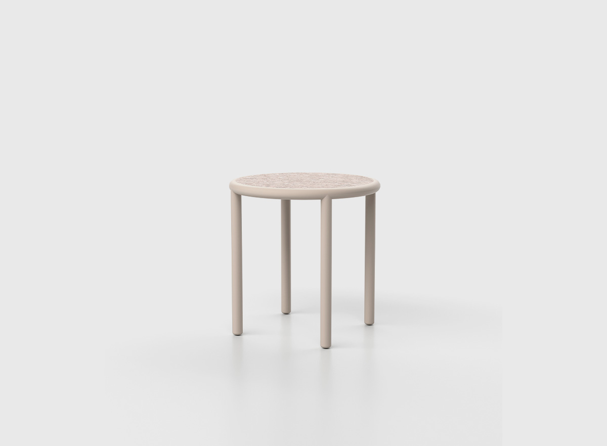 Mesa de rincón que combina una estructura sólida de aluminio en tono white wash con una superficie de Dekton VK03, lo que le añade un toque de distinción y elegancia.
