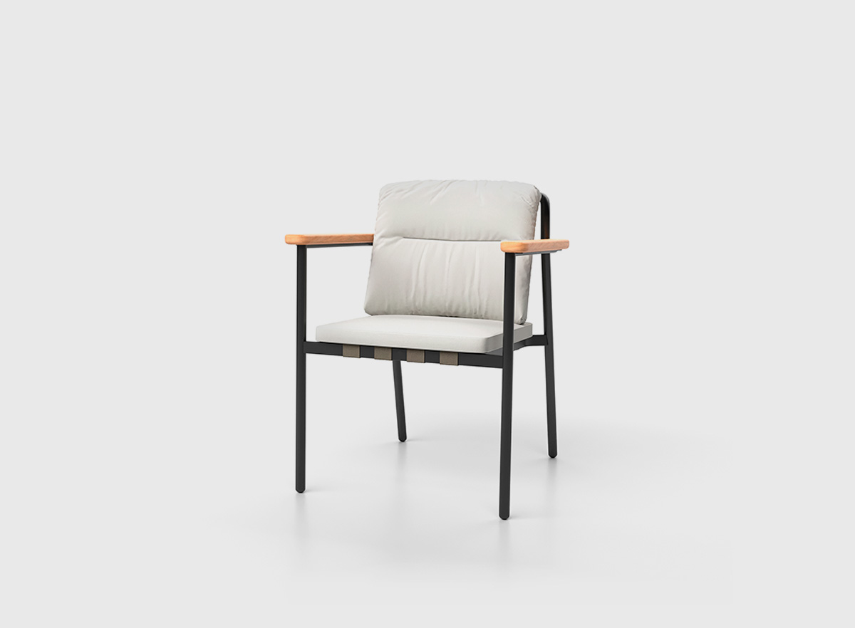 Sillón de comedor con estructura de aluminio con un elegante acabado en tono carbón mate, y reposabrazos de teca. El respaldo está trenzado con cinta beige 35x2, garantizando durabilidad y estilo.