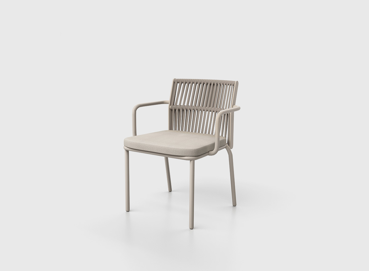 Sillón con estructura de aluminio acabado en tono white wash, y el respaldo trenzado con cuerda Atmospher, combinando fuerza y elegancia.