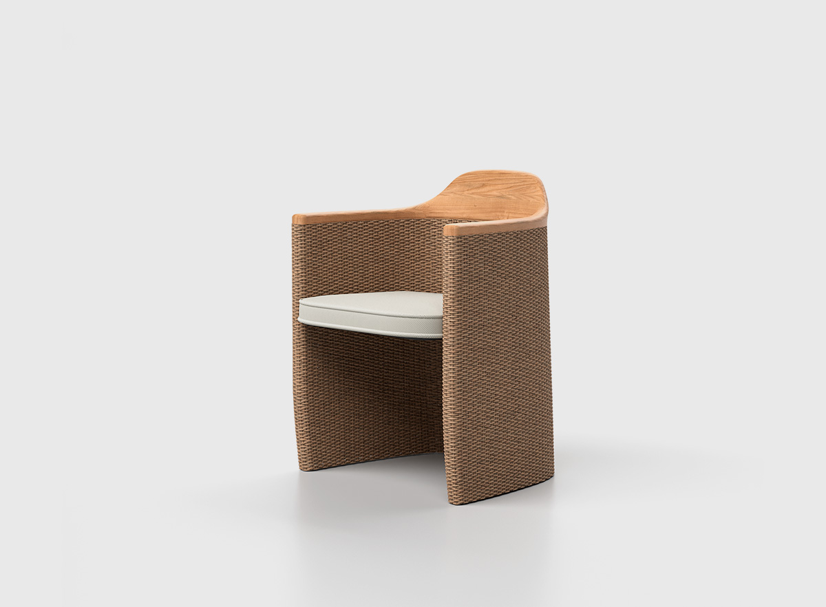 Sillón comedor con estructura de teca natural y fibra banana trenzada de 20 mm. La calidez de la madera se combina con la textura orgánica del trenzado, creando un ambiente acogedor y sofisticado.
