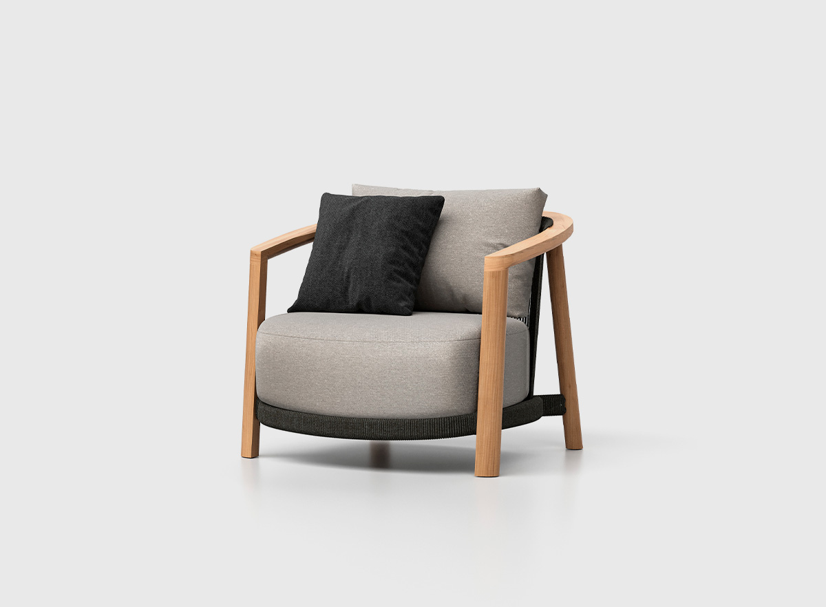 Sillón con estructura de teca natural, que no solo garantiza durabilidad y resistencia, sino que también evoca una conexión con la naturaleza, realzando la atmósfera de la habitación. Además, el trenzado de cuerda negra de 6 y 10 mm aporta un toque contemporáneo y sofisticado, creando un interesante contraste con la madera natural.