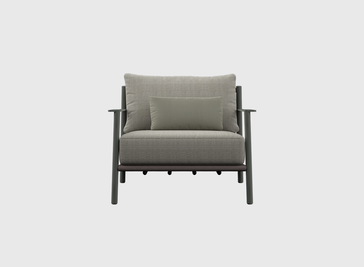 Redefine la elegancia contemporánea: su estructura en aluminio Cement Grey se funde con el trenzado artesanal en polyrope Grau Beige 6 mm, creando un asiento ligero, resistente y visualmente envolvente, perfecto para disfrutar con estilo cada momento al aire libre.